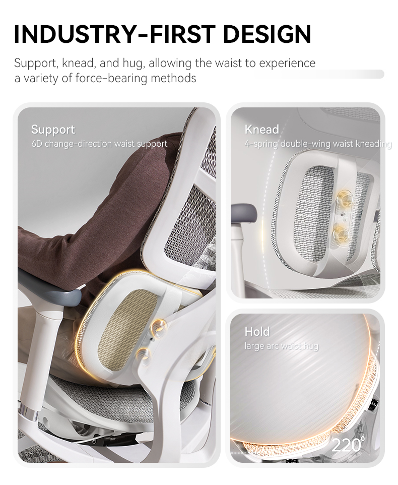Kursi ergonomis Sihoo Doro S100 menonjol dengan penyangga lumbar dinamis ganda yang inovatif, yang menggabungkan mekanisme adaptif dinamis dengan empat pegas untuk penyesuaian otomatis 6D. Sistem ini beradaptasi dengan berbagai bentuk dan postur tubuh, memastikan penyangga pinggang yang optimal untuk meningkatkan kenyamanan. Kursi ini juga dilengkapi dengan sandaran tangan terkoordinasi 4D, yang dapat disesuaikan ke empat arah untuk memberikan dukungan khusus untuk lengan dan membantu mengurangi ketegangan bahu. Sandaran lengan berkoordinasi dengan sandaran selama berbaring, menawarkan solusi ergonomis yang komprehensif untuk penggunaan berjam-jam.